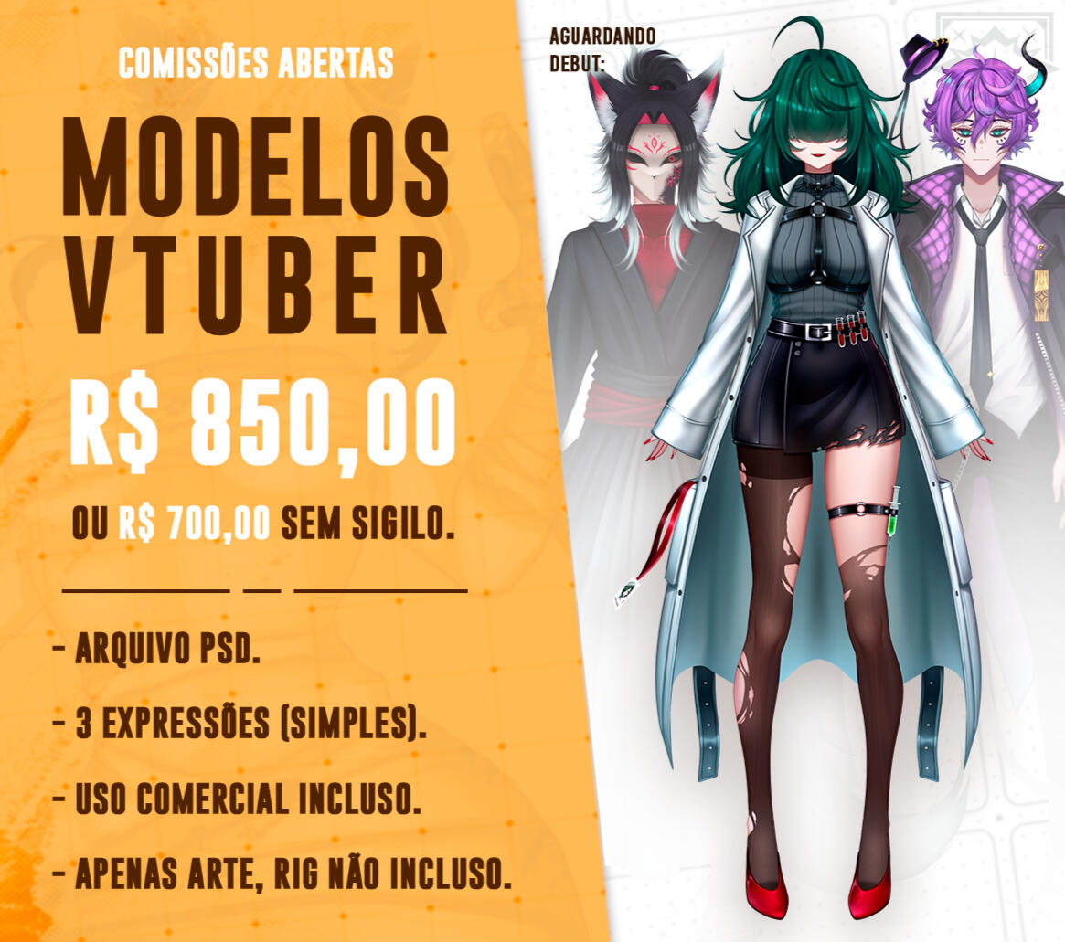 | Modelo VTuber | R$ 850,00 | Arte do Modelo + 3 Expressões (Raiva, Corada e Medo) |